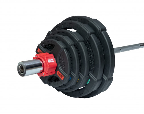 - В центре комплекта находится гриф OB86 длиной 220 см с хромированным покрытием. Его диаметр 50 мм обеспечивает комфортный хват, а заявленная нагрузочная способность до 250 кг говорит о высокой прочности конструкции