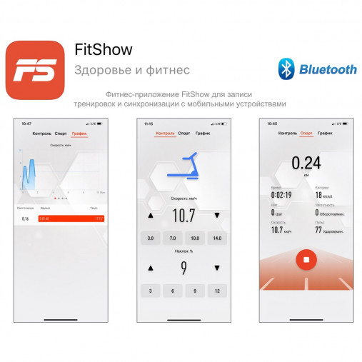 - Показания дисплея:время, скорость, дистанция, калории, пульс, наклон бегового полотна, быстрое переключение скорости с шагом 4,8,12 км/ч и переключение угла наклона бегового полотна с шагом 4,8,12%